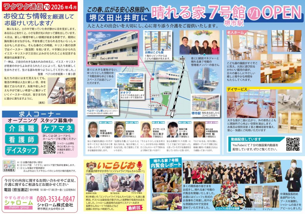 ◆ワクワク通信 2026年4月号 執筆者 kaigo-shalom | 2026-04-09 | メディア シャロームでは『ワクワク通信』を毎月発行しています(^^♪ 地域情報やシャロームグループのワクワク情報が満載~♪ あなたの街のおすすめ情報があれば、是非教えてください! ※画像をクリックすると拡大してご覧いただけます。